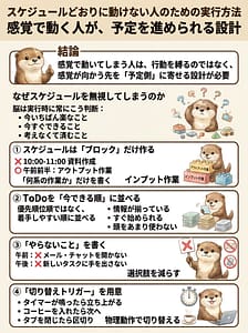 感覚で動いてしまう人が、結果的に予定を進められる設計 スケジュールは綿密に作れる。でも、いざ実行の時間になると、 そして最後に、「またできなかった」という罪悪感が残る。 これは意志が弱いからではありません。スケジュールの […]