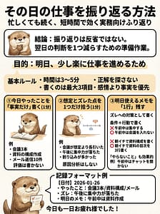 忙しくても続く、短時間で効く実務向けふり返り 1日の終わりに、仕事を振り返っていますか。 多くの人が、このどれかです。 ですが実は、振り返りを「正しく・短く・記録付き」で行うかどうかで、翌日の仕事の回りやすさは大きく変わ […]