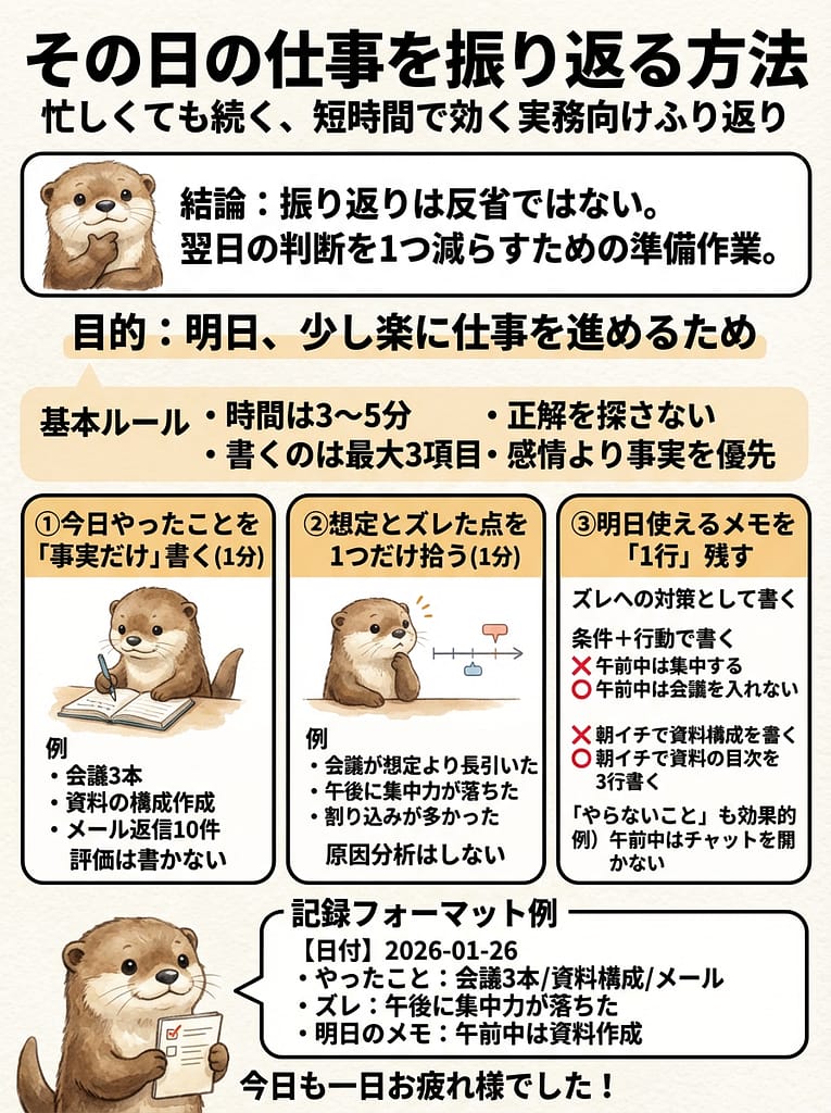 振り返りを「正しく・短く・記録付き」で行うかどうかで、